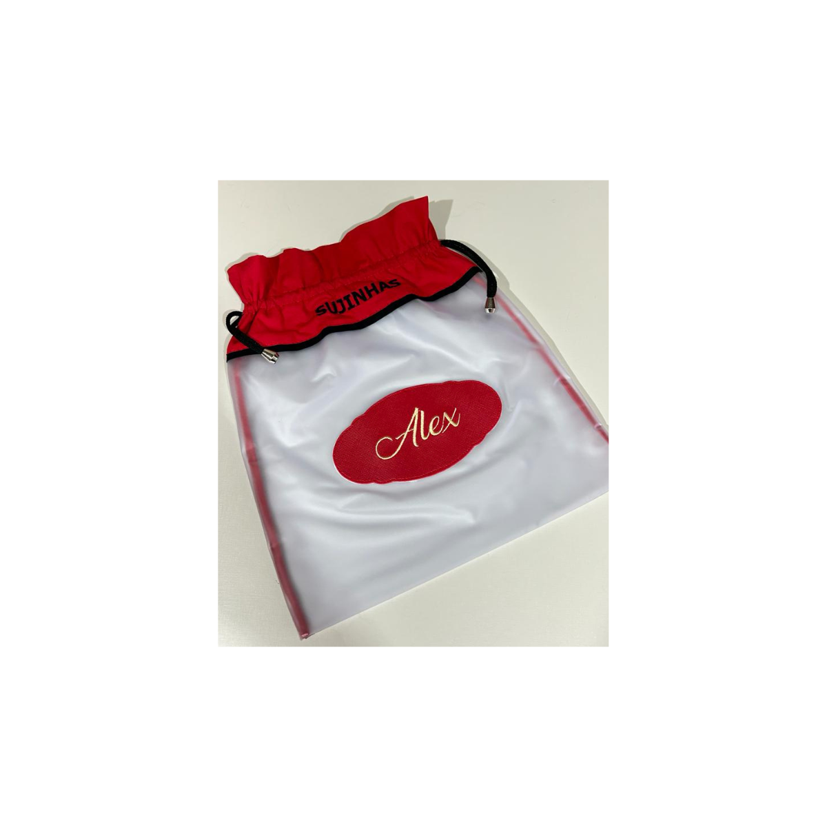Bolsa confeccionada em plástico translúcido e tecido, com costura reforçada.